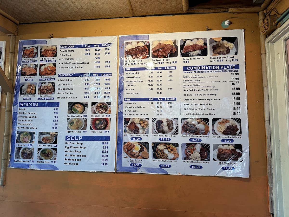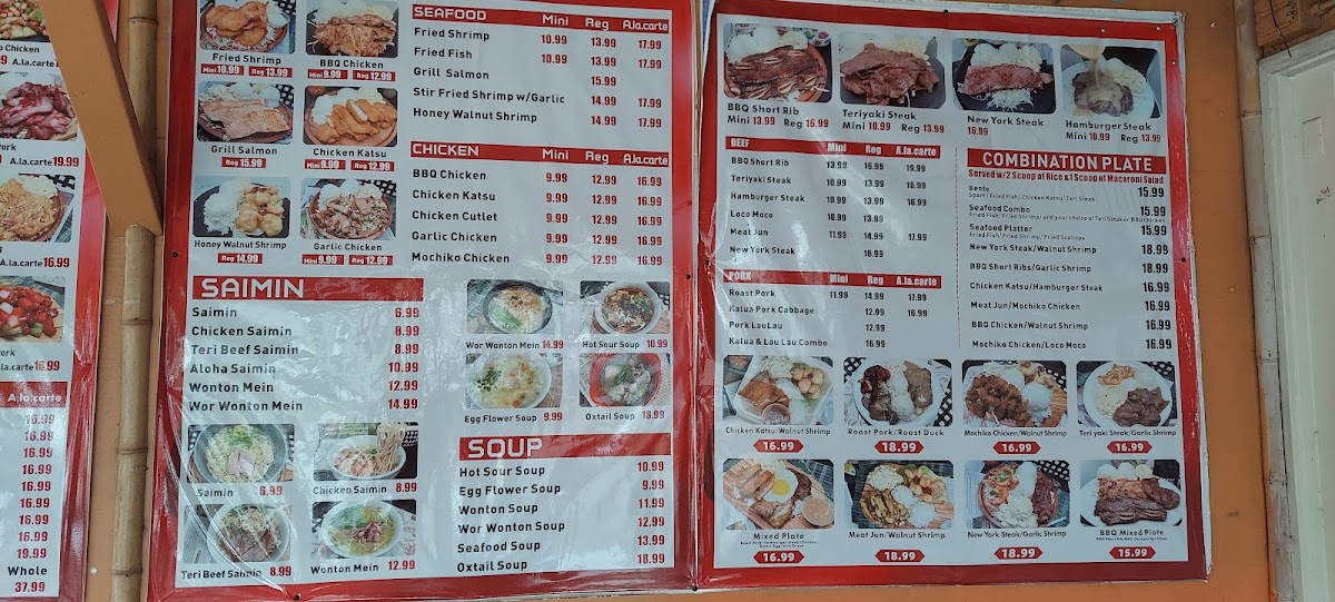 Mini plate: served with 1 scoop of rice and 1 scoop of macaroni salad. Regular plate: served with 2 scoops of rice and 1 scoop of macaroni salad. ala carte:family style